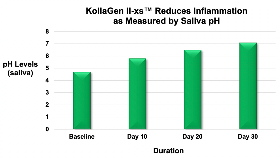 Salivary pH is a biomarker for inflammation. Study subjects taking KollaGen Il-xs had their pH levels return to the normal range 6.2 to 7. in less than 30 days.