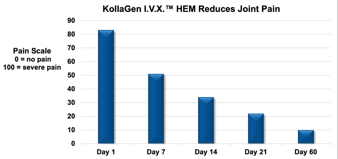 A Clinical trial with 20 people with joint pain, using 750 mg/day of 50/50 mixture of KollaGen II-xs and KollaGen I.V.X.HEM, showed a reduction in pain from 10 to 1.5 in 30 days (see below for graph). Again saliva PH was normalized from 4.7 to 7.5. This trial was performed by Molecular Biology International 3901 Dogwood Ave Sioux Center IA 51250. Another clinical trial using just Kollagen I.V.X.HEM with 20 people in 30 days showed an average improvement in pain from 8.5 to 1.0. It also normalized glucose levels in two of the subjects that were diabetic.